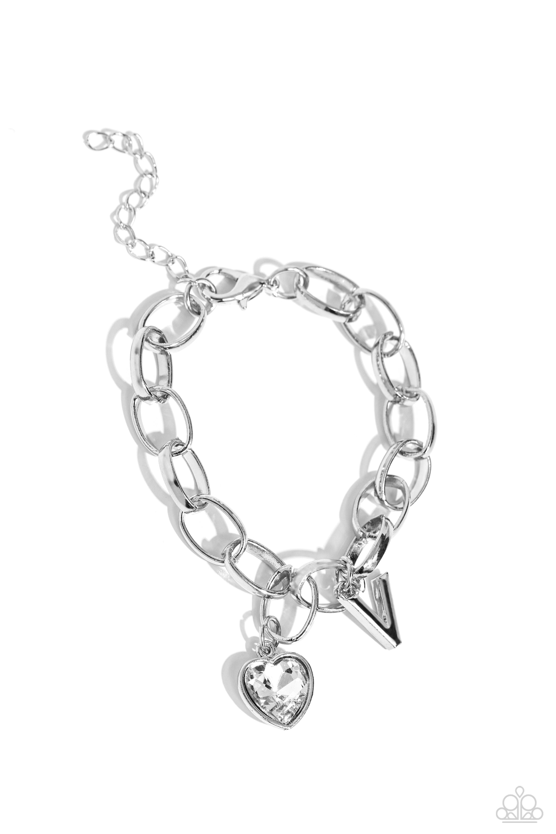 A simple collection of silver charms — including a white rhinestone heart pressed in a silver frame and a sleek letter "V" — dance from a chunky silver chain around the wrist, creating a sentimental fringe. Features an adjustable clasp closure.