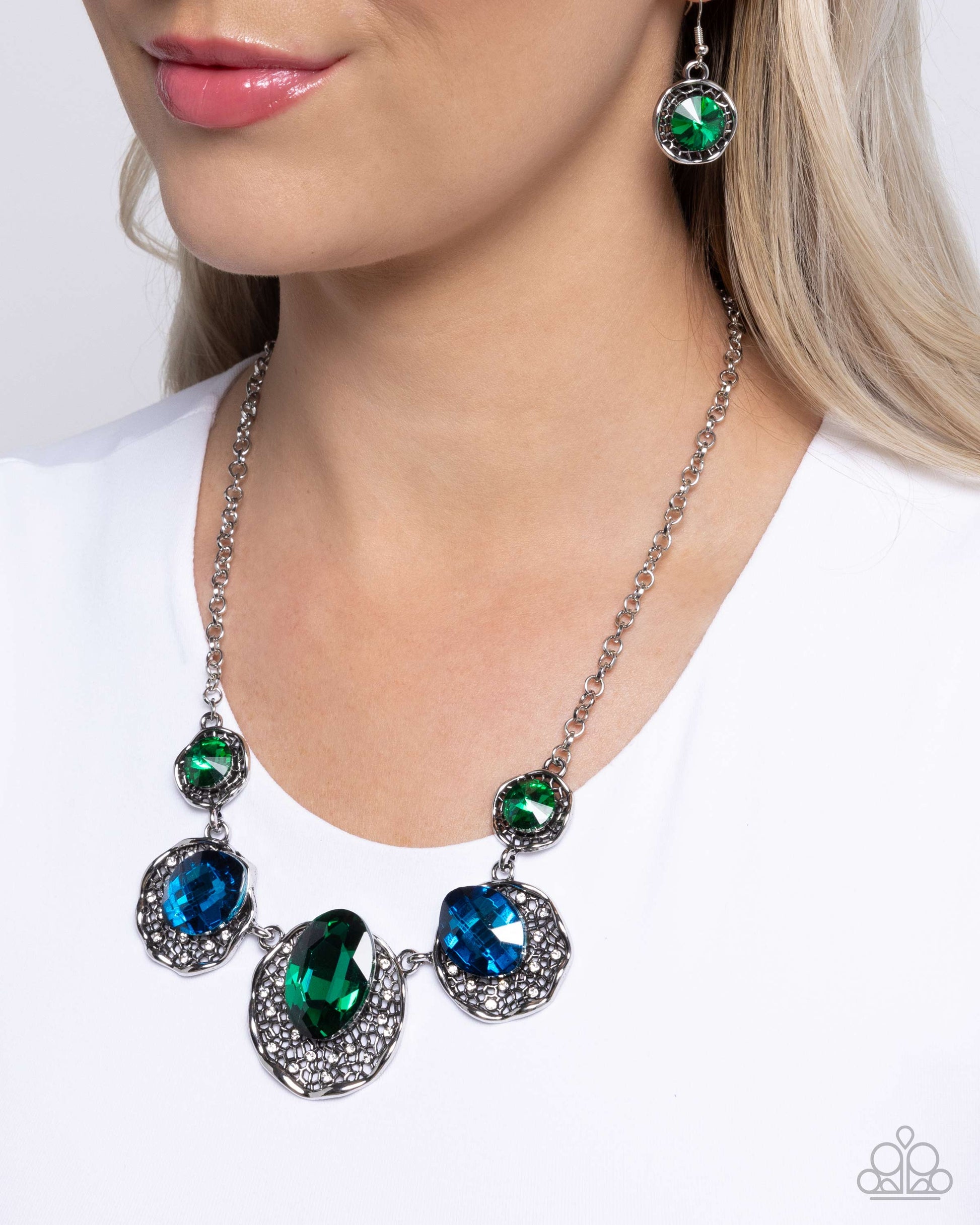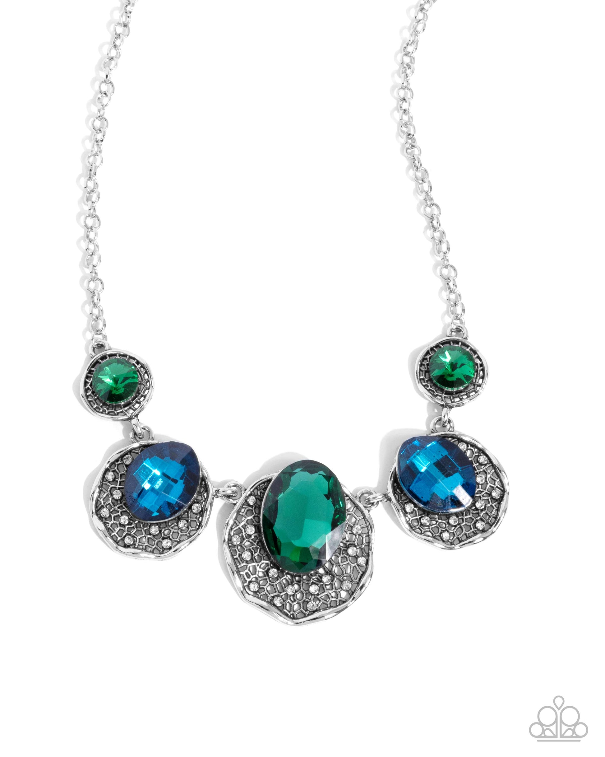 Set in frames of webbed silver, a collection of green and blue round, rounded oval, and oval gems gradually increase in size along the neckline from a classic silver chain for a radiantly refined display. Features an adjustable clasp closure.