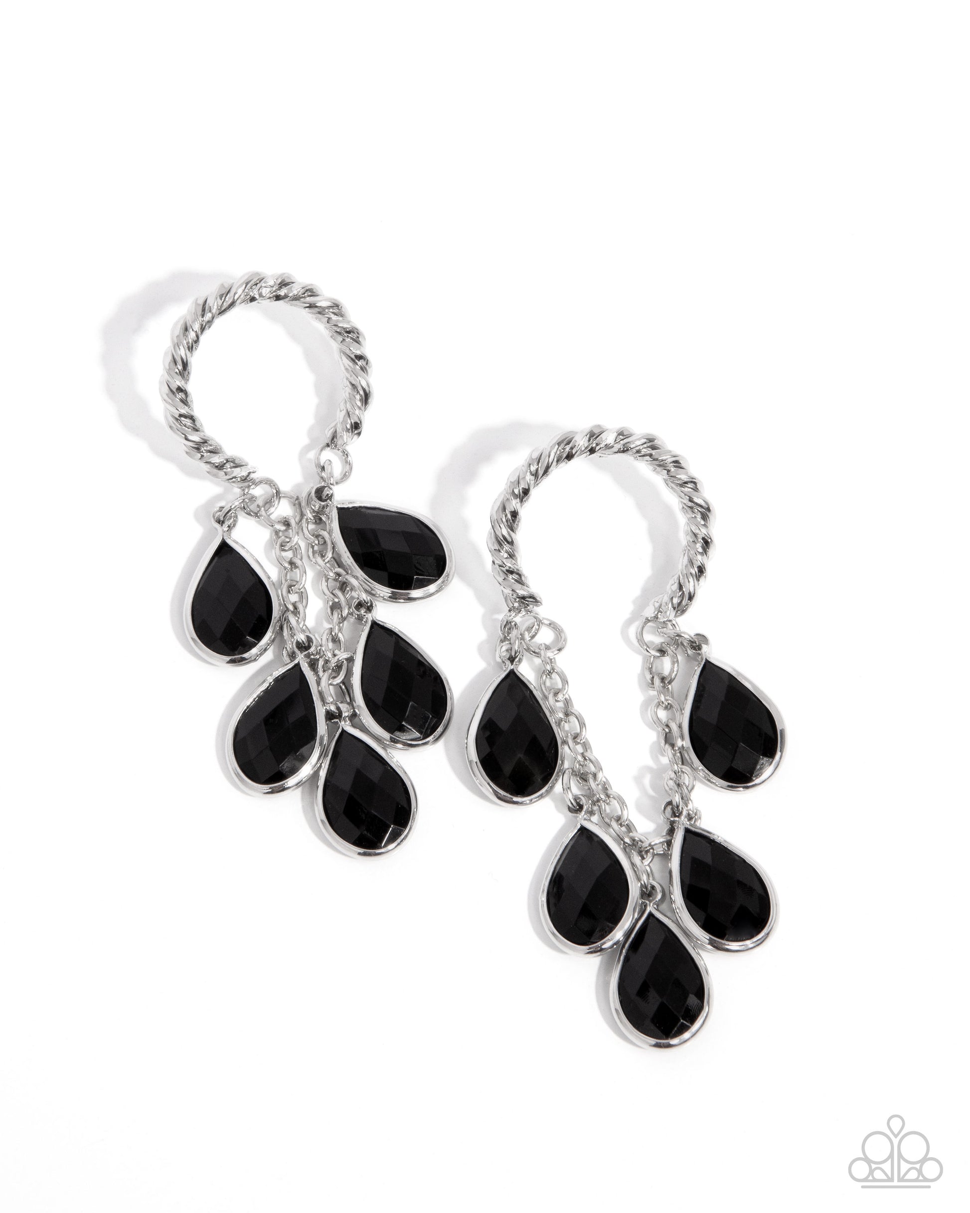 Cascading in a tapered display along a silver chain, a collection of faceted black teardrop gems in silver fittings gives way from a horseshoe-inspired hoop of twisted silver for a shimmery chandelier. Earring attaches to a standard post fitting.