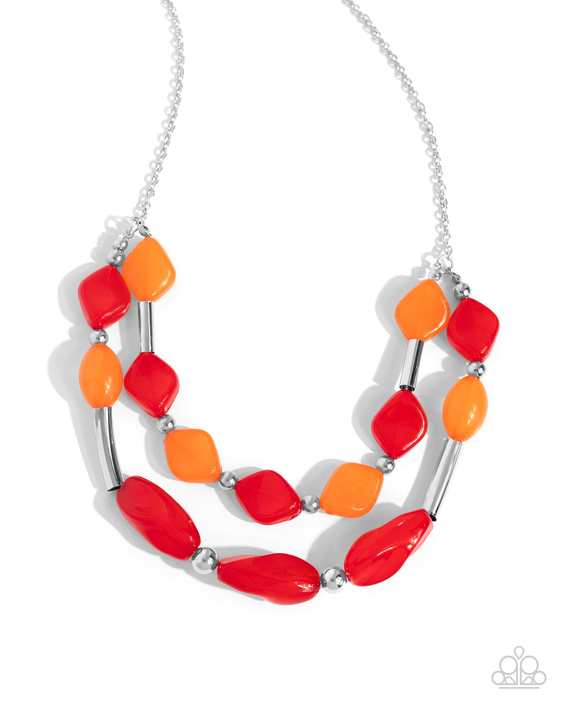 A dainty silver chain gradually splits into two distinct strands infused with orange and red abstract beads, silver beads, and silver cylindrical beads for a Malibu-inspired medley of color. Features an adjustable clasp closure.
