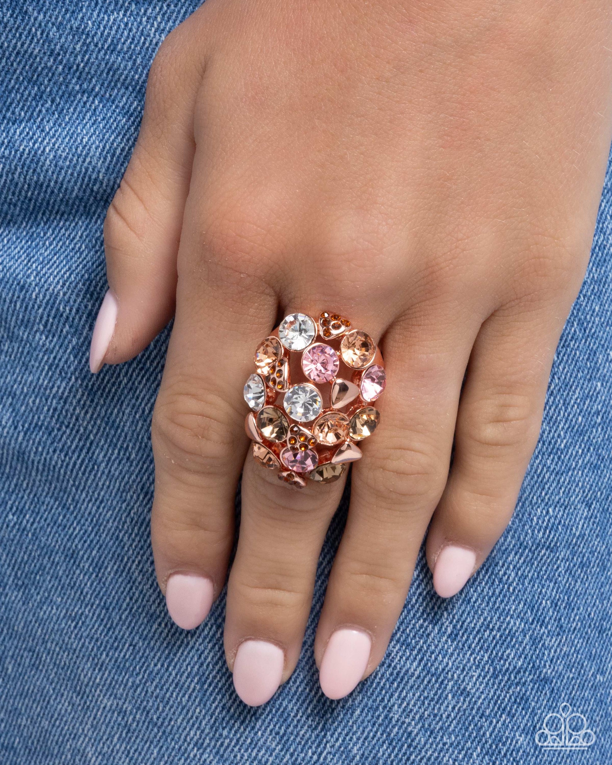 Clusters of rhinestones in shades of light peach, light rose, Smoked Topaz, and Tea are scattered across a shiny copper backdrop, creating a sparkling and warm-toned design. Complemented with abstract shiny copper accents, the ring’s eclectic mix of shapes and colors offers a bold, vintage-inspired statement. Features a stretchy band for a flexible fit.