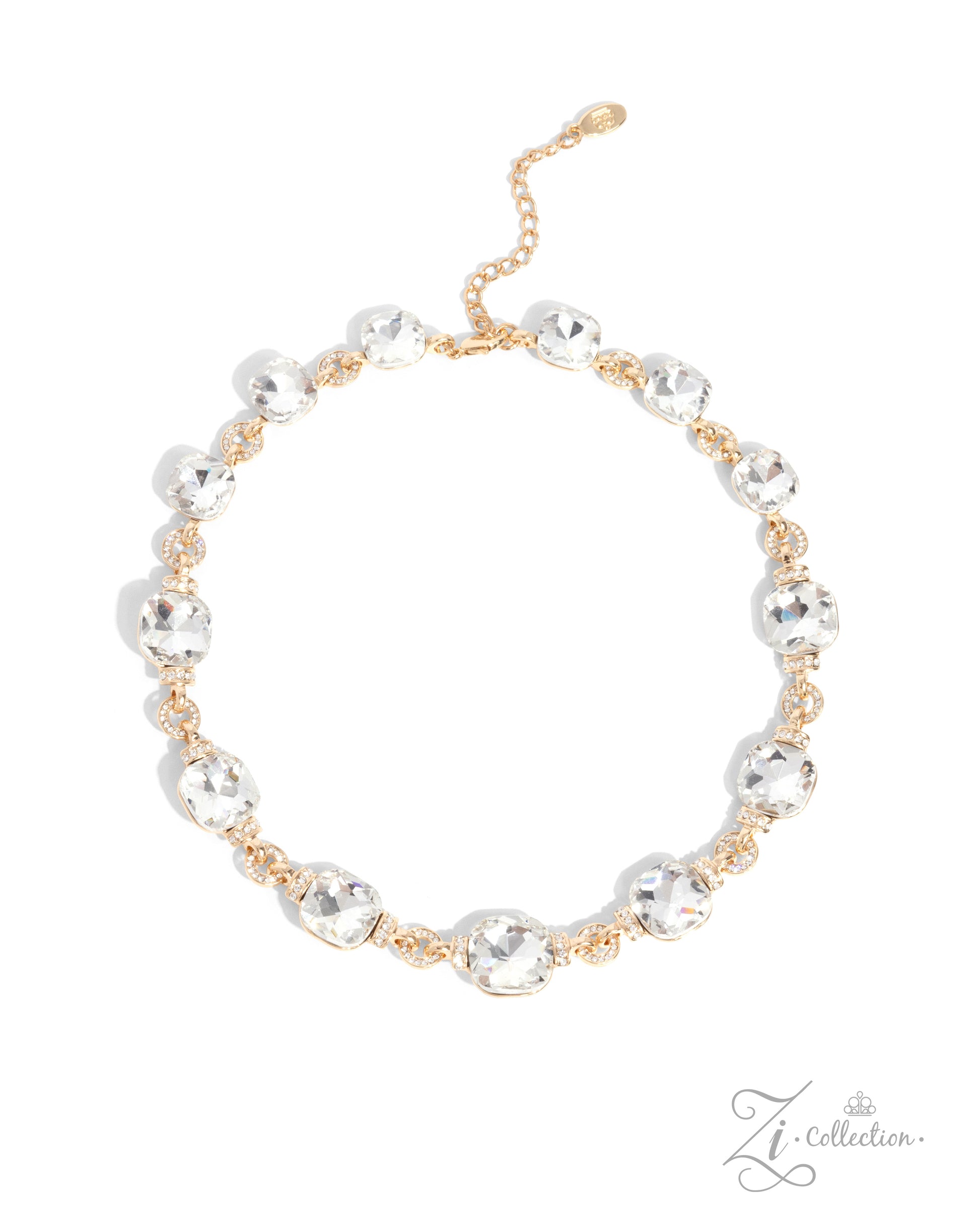 A solitaire row of dramatically asscher-cut white gems sparkles blindingly along the collar, bordered by white rhinestone-encrusted round gold fittings. White rhinestone-encrusted gold rings alternate alongside the gems giving this showstopper some exaggerated depth and dazzle. Features an adjustable clasp closure.