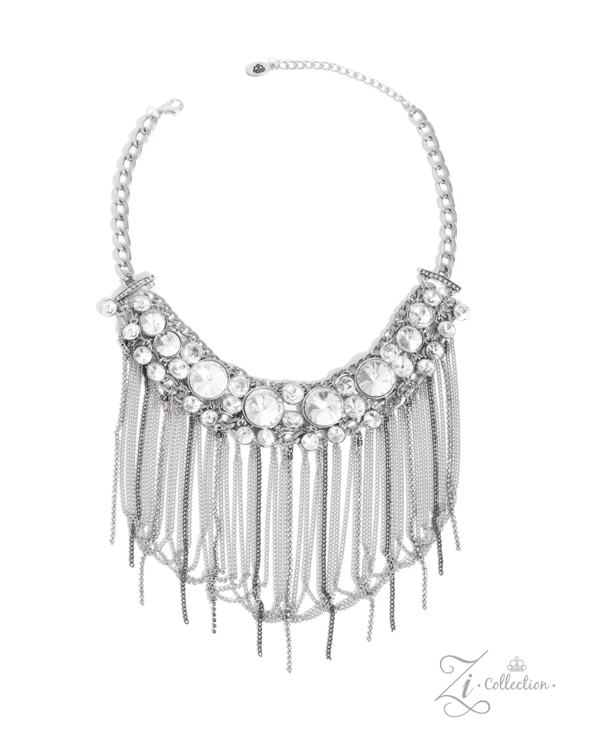 Anchored between white rhinestone-embellished horizontal fittings, rows of glittery, white gems in varying sizes adorn the neckline between two silver curb chain strands, creating dazzling dimension and eye-catching elegance. Free-falling silver and gunmetal chains drape and collect below the extravagant row, creating a dramatic, sassy fringe for a show-stopping finish. Features an adjustable clasp closure.
